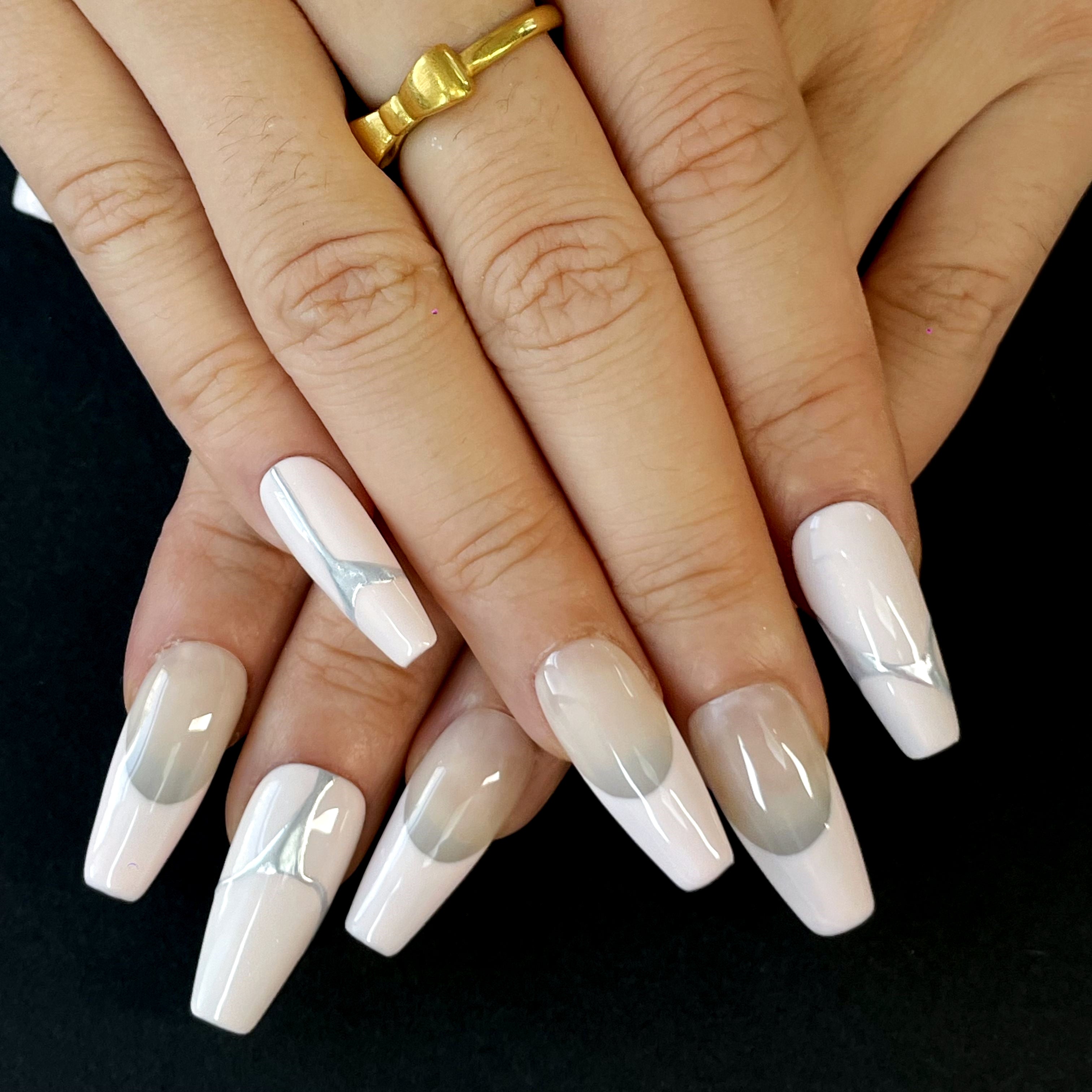 Minimalist Press-On Nails – Ivory & Light Gray with Silver Line Accents, Elegant and Fashionable Design for Everyday Chic Looks(K25)
