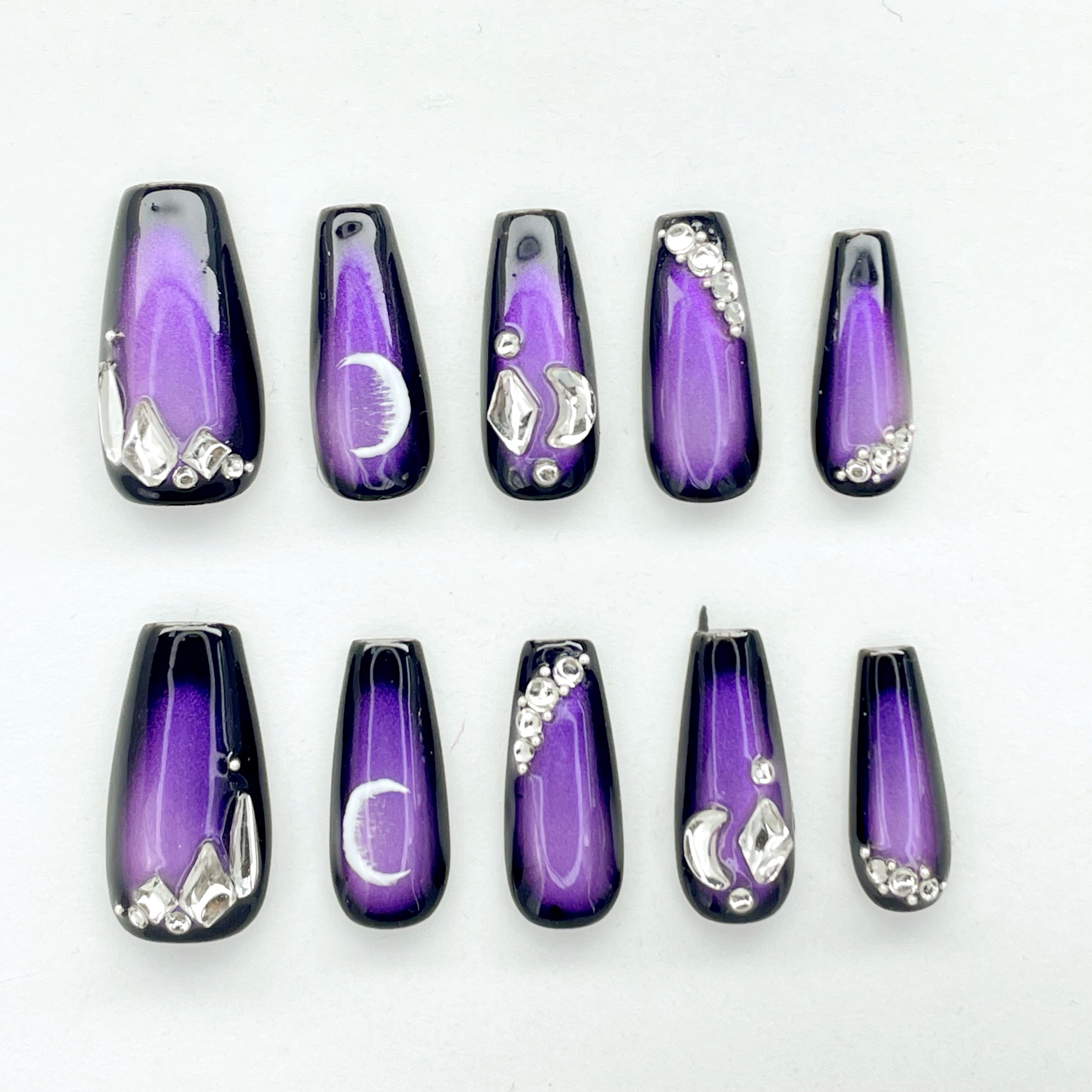 Purple Cat Eye Medium Long Coffin Nails with Hand-painted Moon Design, Handmade – Perfect for Mysterious and Enchanting Styles(27)